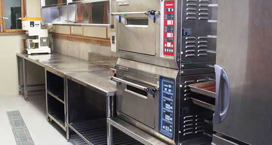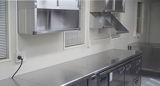 | 別棟の改装に伴い、1階を全て厨房にされましたので、機器の増設と営業の妨げにならないよう既存厨房からの移設を行いました。 コースがメインのお店ですが、ウェディングパーティーなど、大人数の対応も必要とされる為、別注ガスレンジ、スチームコンベクションオーブン等、新たな機器を設置すると共に、各ラインで盛付・食器保管が出来るよう機器を配置しました。 調理スタッフが多い為、通路を広くし、シェフが料理工程の全てを一望できるよう、調理ラインをアイランド型に配置し、また客席となる2階へ通るお客様から厨房が見えるため、弊社が得意とする別注の板金製品を製作し、収納スペースを多く設けました。 パティシエ作業スペース、洗浄スペースを別室で設ける事により、ピークタイムとパーティー営業がかぶっても混乱しないよう、スムーズな調理、提供をメインにレイアウトされた厨房にしました。 | |